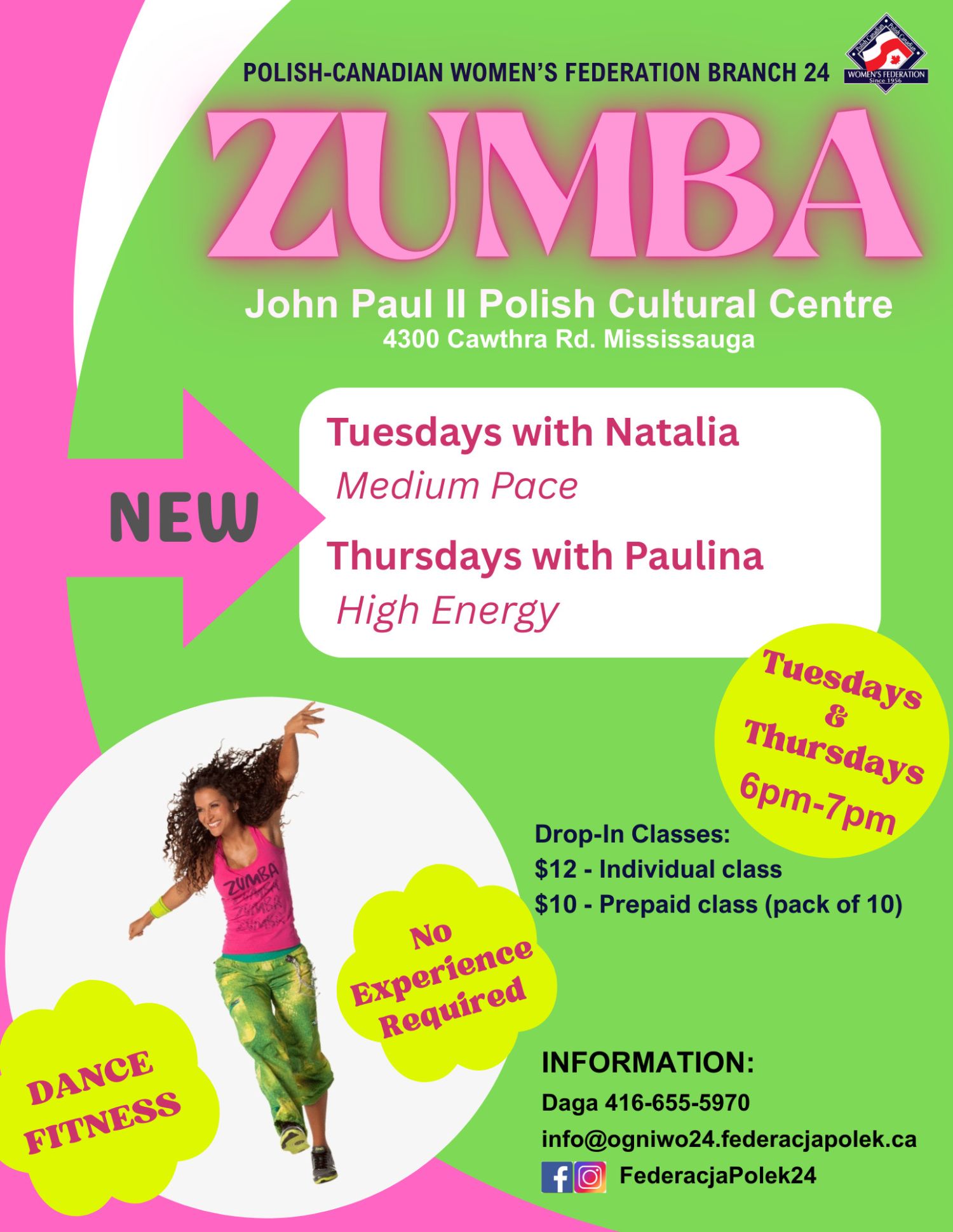 Zumba to idealny sposób na poprawę kondycji, spalenie kalorii i dobre samopoczucie!Kiedy: W kazdy wtorek i czwartek, 6pm-7pm Wtorki z Natalia - Medium Pace Czwartki z Paulina - High EnergyGdzie: w Polskim Centrum Kultury JPII, MississaugaKoszt: $12 - indywidualna klasa ($10 - prepaid. pakiet 10)Energetyczna muzyka, motywujaca instruktorka, pozytywna atmosfera i mnóstwo ruchu gwarantowane!Nie musisz być profesjonalnym tancerzem – wystarczy chęć do zabawy. Zabierz ze sobą wygodny strój, wodę i pozytywne nastawienie. Dołącz do nas i przekonaj się, jak świetnie można spędzić czas, dbając o siebie!Przyjdz w najblizszy wtorek lub czwartek!Do zobaczenia na parkiecie!