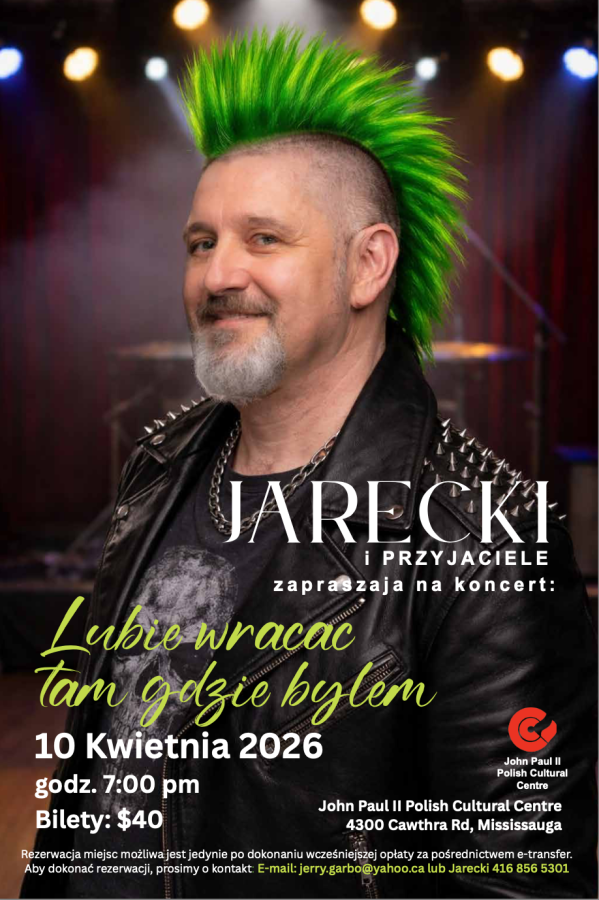Rezerwacje i bilety w cenie 70$: Joanna Szydłowska 905 819 1040, oraz Joanna Strzezek 905 845 3553, a także w polonijnym sklepie „Health from Nature” przy Roncesvalles oraz w Polskim Centrum Kultury. Serdecznie zapraszamy.